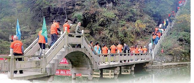 “遙知兄弟登高處,遍插茱萸少一人?!敝仃柟?jié)有登高的習(xí)俗。“我鍛煉我健康我快樂我幸福!”10月28日上午,思禮鎮(zhèn)九里溝風(fēng)景區(qū)茱萸峰山道上,傳來一陣陣鏗鏘有力的吶喊聲,一群身著橘黃色T恤的老年人喊著口號朝山頂走去。他們周圍,同樣身著橘黃色T恤的游客或停下來拍照、或三兩結(jié)伴嬉笑著向前,秋日里的茱萸峰一片歡騰。由思禮鎮(zhèn)政府、市體育局、市文明辦、市旅發(fā)委、團(tuán)市委主辦的2017年濟(jì)源市思禮鎮(zhèn)“盧仝杯”全民健身登山活動在九里溝風(fēng)景區(qū)茱萸峰舉行。本次活動以“九九重陽節(jié)·相約茱萸峰”為主題,吸引了2000多名登山愛好者參與。