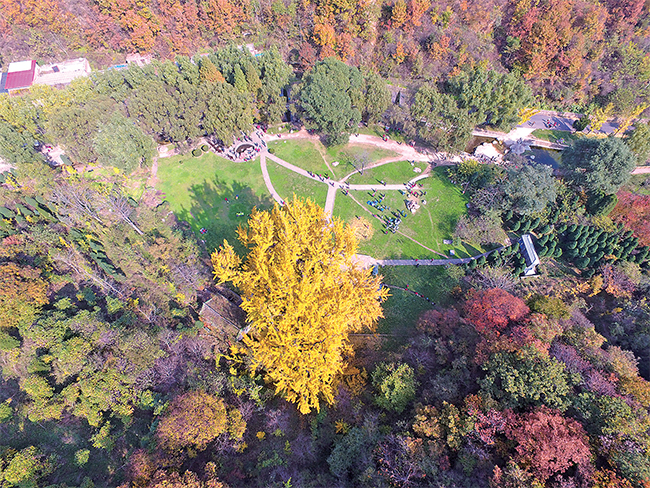再前行,不僅是紅葉,千年銀杏也悄悄換上了金色的舞衣,輕撫紗袖,款款而來,和著風(fēng)聲,向游人悄悄細(xì)語。遠(yuǎn)看,好似一片金色的霞光,那些葉子,在風(fēng)中飄落,似無數(shù)只金色的蝴蝶漫天飛舞,引得游人紛紛駐足觀賞;飄落地上,又好似為大地鋪上了一層金色的地毯,松軟,迷人,把大地裝扮得格外亮麗。