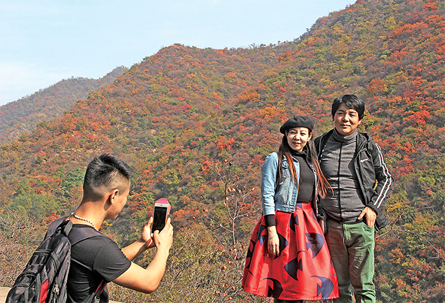 沿著景區(qū)道路前行,秋風(fēng)卷起萬千落葉,交織成一件漂亮的羽衣,令人目眩神迷。路上,游客如云,或是闊步前行;或是賞景拍照留念;或是駐足小憩呼吸新鮮空氣。