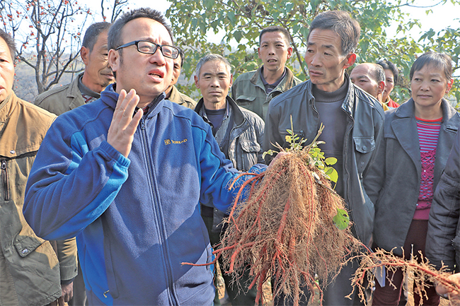 11月6日,在王屋鎮(zhèn)竹泉村,技術(shù)人員向村民傳授丹參生產(chǎn)管理知識(shí)。