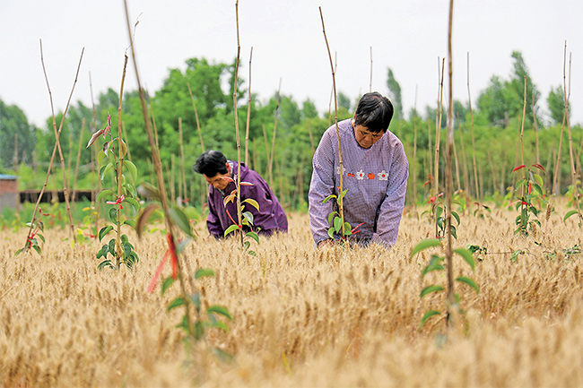 5月30日,軹城鎮(zhèn)中王村農(nóng)民在麥田里管理果樹苗木。