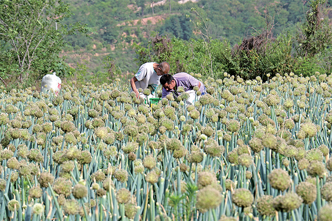 6月2日,坡頭鎮(zhèn)栗樹溝村農(nóng)戶正在采收洋蔥種子。