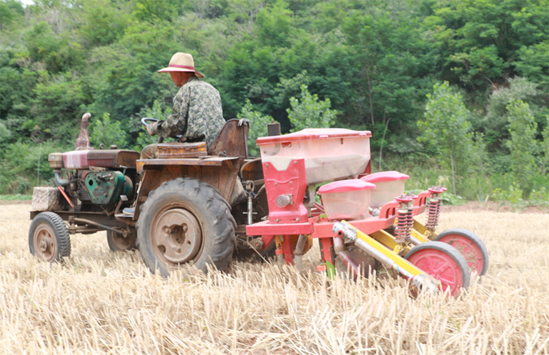 6月7日,隨著小麥?zhǔn)崭罱咏猜?,承留?zhèn)栗子村的村民們開始在收割過的小麥田里播種玉米。