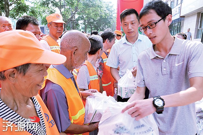 8月13日,在亞橋社區(qū),愛(ài)心人士為環(huán)衛(wèi)工贈(zèng)送消暑用品。