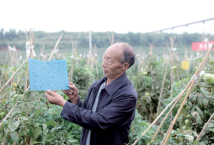 9月17日,王屋鎮(zhèn)柏木凹村村民在番茄地查看誘蟲藍板。我市加快現(xiàn)代化農(nóng)業(yè)發(fā)展,在王屋鎮(zhèn)建立了高山蔬菜病蟲害全程綠色防控示范基地,示范面積1000畝。基地內積極推廣殺蟲燈誘殺技術、色板誘殺技術、昆蟲信息素誘殺技術、低容量噴霧技術等,在提升農(nóng)產(chǎn)品質量的同時,實現(xiàn)了經(jīng)濟、社會、生態(tài)效益的共贏,促進了山區(qū)群眾致富增收。(記者 郭躍軍 攝)