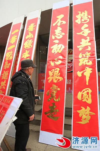 年貨攤主梁先生告訴濟源網(wǎng)記者,近兩年來,體現(xiàn)新時代新精神的春聯(lián)非常有時代意義,充滿了正能量,頗受市民喜愛,開市一上午,就賣出去近十副了。