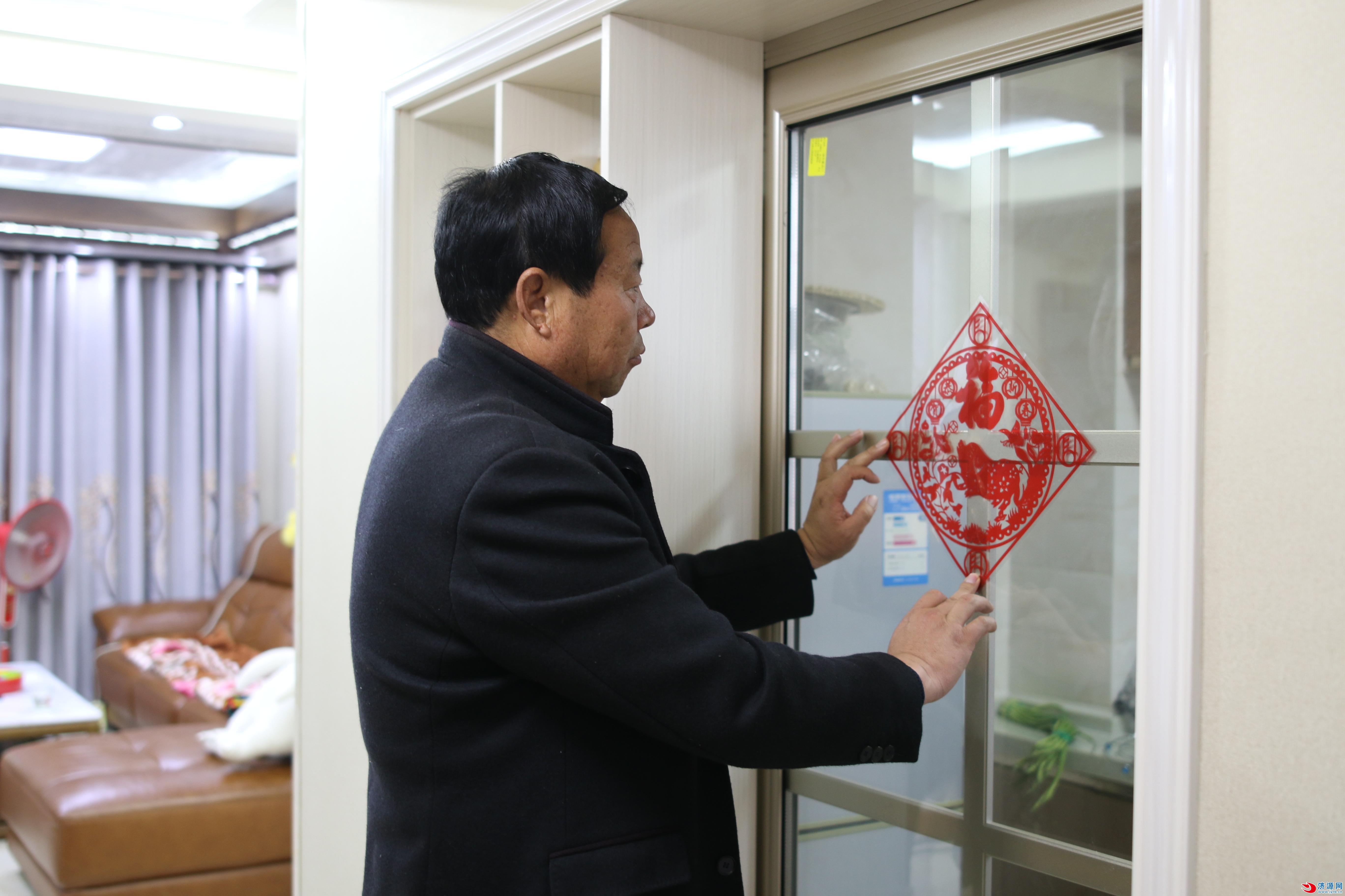 三室一廳的房子收拾得一塵不染,茶幾上裝滿(mǎn)糖果,客廳內(nèi)盛開(kāi)的鮮花格外溫馨。2月2日,濟(jì)源網(wǎng)記者在沁園春天B區(qū)8樓見(jiàn)到了剛搬進(jìn)安置新房的村民王群生,今年53歲的他正忙著在門(mén)上貼春聯(lián)、貼“?!弊郑瑵鉂獾哪晡稉涿娑鴣?lái)。