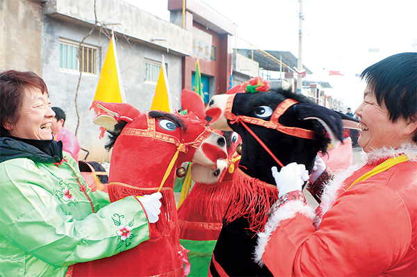 在梨林鎮(zhèn)朱村,又是另一番景象,只見村里里三層外三層擠滿了觀看匯演的村民。民俗節(jié)目踩高蹺、騎毛驢輪番上演。村民們騎在“毛驢”身上,雙手緊握韁繩,跑動時故意晃蕩,雙腿模仿著毛驢的各種動作,前蹦后跳、仰頭、搖尾……把“毛驢”表演得栩栩如生。驢官帶著假胡子做著各種幽默詼諧的動作,時不時與村民互動,引得大家哈哈大笑?!安雀哕E、騎毛驢可是我們村的民俗特色。”驢官扮演者魏志艷說,“元宵節(jié)文藝匯演,村里老小齊上陣。別看踩高蹺的小孩兒只有七八歲,可扭動腰肢,穩(wěn)步向前不在話下?!?/p>