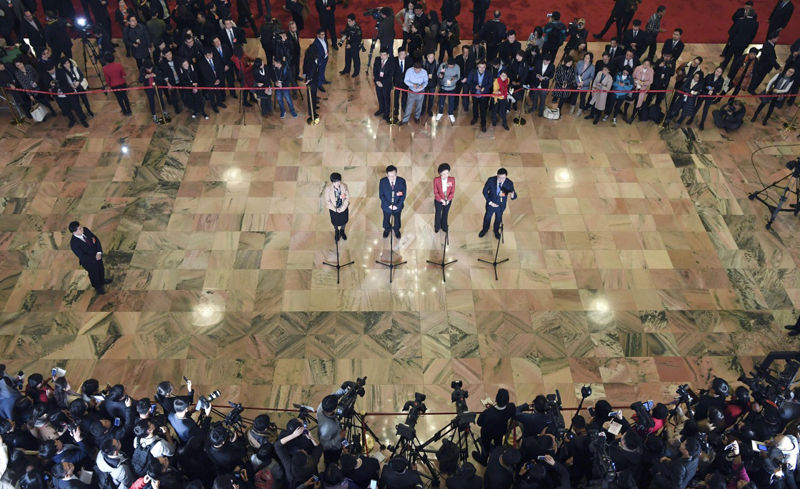 3月3日,中國(guó)人民政治協(xié)商會(huì)議第十三屆全國(guó)委員會(huì)第二次會(huì)議在北京人民大會(huì)堂開幕。這是全國(guó)政協(xié)委員王寧利、海霞、張?jiān)朴?、余留芬(從右至左)在“委員通道”接受采訪。