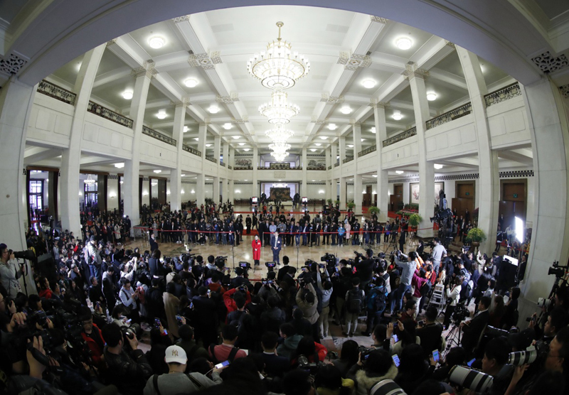 3月3日,中國人民政治協(xié)商會議第十三屆全國委員會第二次會議在北京人民大會堂開幕。這是全國政協(xié)委員吳偉仁(右)、陳馮富珍在“委員通道”接受采訪。