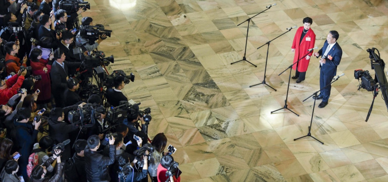 3月3日,中國(guó)人民政治協(xié)商會(huì)議第十三屆全國(guó)委員會(huì)第二次會(huì)議在北京人民大會(huì)堂開(kāi)幕。這是全國(guó)政協(xié)委員吳偉仁(右一)、陳馮富珍(右二)在“委員通道”接受采訪。