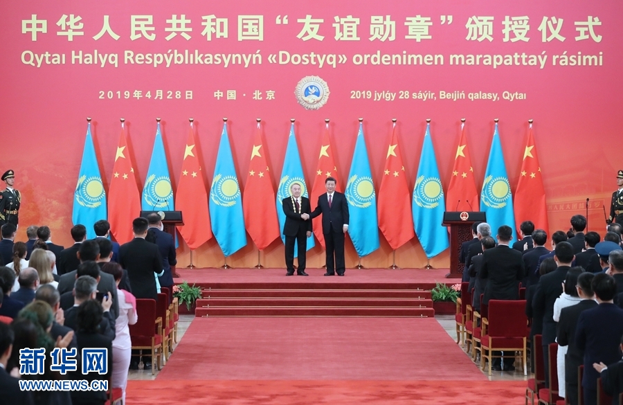 納扎爾巴耶夫致答辭。納扎爾巴耶夫表示,非常感謝習(xí)近平主席今天向我頒授中華人民共和國“友誼勛章”,這對我是無上榮譽。這枚勛章反映了中方對我致力于推進哈中全面戰(zhàn)略伙伴關(guān)系努力的高度認(rèn)可。哈中在相互尊重和相互信任基礎(chǔ)上建立起的友好關(guān)系已經(jīng)成為國與國關(guān)系的典范,兩國間沒有任何未決問題。我同中國領(lǐng)導(dǎo)人之間的深厚友誼和互信將永遠留在我心里。我衷心祝賀中國成功舉辦第二屆“一帶一路”國際合作高峰論壇。習(xí)近平主席提出的“一帶一路”倡議,已經(jīng)成為成功的國際合作平臺,不僅推動了亞歐大陸的共同發(fā)展,也促進了世界的和平與繁榮。在中華人民共和國成立70周年之際,我衷心祝愿中國人民在以習(xí)近平同志為核心的中國共產(chǎn)黨領(lǐng)導(dǎo)下,順利實現(xiàn)中華民族偉大復(fù)興的中國夢。中國的發(fā)展繁榮對世界是重大利好。