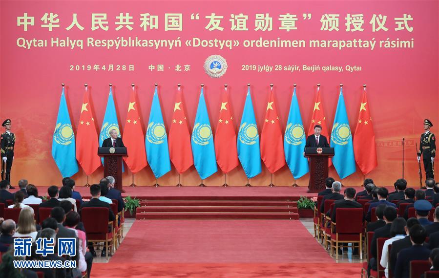 新華社北京4月28日電(記者白潔、馬巖)國家主席習(xí)近平28日在人民大會堂中央大廳為哈薩克斯坦首任總統(tǒng)納扎爾巴耶夫舉行“友誼勛章”頒授儀式。