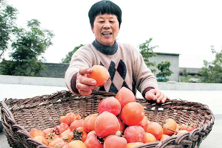 10月16日,在五龍口鎮(zhèn)山口村,農(nóng)民正在展示摘下來的柿子