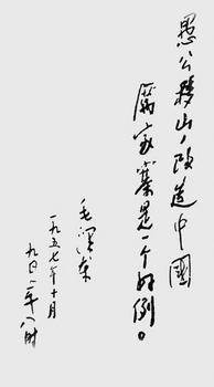 1957年10月9日,一份來自山東莒南縣的關(guān)于農(nóng)業(yè)生產(chǎn)的報告送到了毛澤東主席的辦公桌上,報告的題目是《山東省莒南縣厲家寨大山農(nóng)業(yè)社千方百計爭取豐收再豐收》。毛澤東在這份關(guān)于厲家寨農(nóng)業(yè)豐收的報告上,揮筆寫下了“愚公移山,改造中國,厲家寨是一個好例”的批語。從此,厲家寨名播全國,成為全國農(nóng)業(yè)戰(zhàn)線的先進(jìn)典型。我們今天看到的毛澤東手書的“愚公移山,改造中國”八個字,就是從當(dāng)年毛澤東的批語中摘取的。毛澤東的批語,很快成為鼓舞全國人民改造山河的偉大號召。廣大人民群眾以前所未有的熱情,積極發(fā)展生產(chǎn),創(chuàng)造了一個又一個奇跡。20世紀(jì)五六十年代,最能體現(xiàn)毛澤東“愚公移山改造中國”巨大號召力的是50年代濟(jì)源縣的蟒河綜合治理和60年代林縣(今林州市)紅旗渠建設(shè)工程?! ?/p>