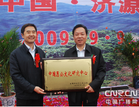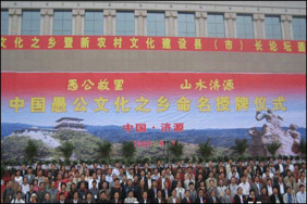 “愚公之鄉(xiāng)”授濟(jì)源。濟(jì)源是愚公移山寓言故事的源發(fā)地。愚公移山文化不僅有深刻的政治內(nèi)涵,時代價值,也有廣泛的群眾基礎(chǔ),一直以來受到國家、省、市的高度重視和關(guān)注。2009年9月9日,“中國愚公文化之鄉(xiāng)”、“中國愚公文化研究中心”命名授牌儀式在濟(jì)源文化城西廣場隆重舉行,中國民協(xié)分黨組書記羅揚(yáng),中國民協(xié)分黨組成員、副秘書長趙鐵信,中國民協(xié)分黨組成員、副秘書長呂軍,中國民協(xié)副主席常嗣新,省文聯(lián)黨組書記吳長忠,省文聯(lián)副主席何白鷗,中國民協(xié)副主席夏挽群,省民協(xié)副主席、副秘書長程健君等以及前來參加中國民間文化之鄉(xiāng)暨新農(nóng)村文化建設(shè)縣(市)長論壇的二百余名代表,一起見證了“中國愚公文化之鄉(xiāng)”、 “中國愚公文化研究中心”的命名授牌。至此,又一個國家級文化品牌——“中國愚公文化之鄉(xiāng)”、“中國愚公文化研究中心”花落濟(jì)源,使得滿目芳菲的中原文化園圃中再添一枝奇葩。