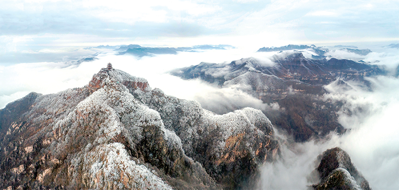 2019年12月初,王屋山上落飛雪,山頂?shù)姆e雪好似與天上的浮云相連,尤為壯美。