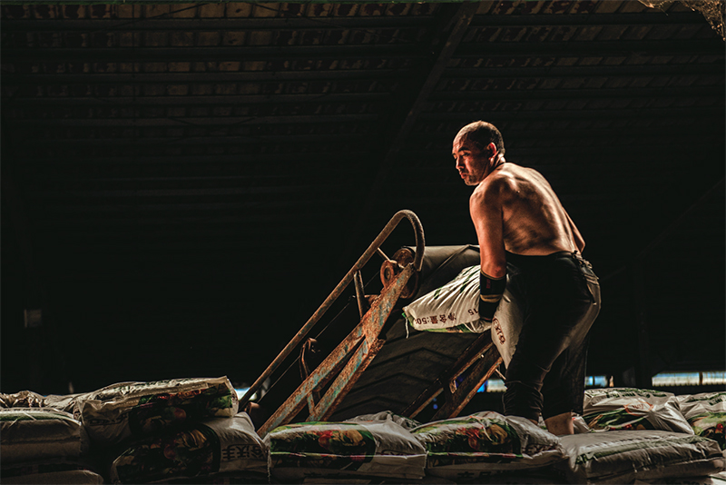 勞動節(jié)當(dāng)天,某化肥廠車間內(nèi),一位光著膀子、皮膚黝黑的漢子正在裝車。