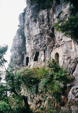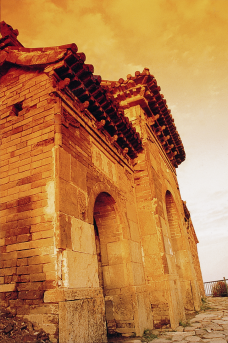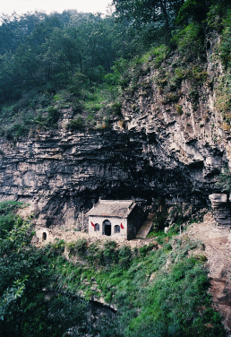 東王母洞建筑 東王母洞,又稱金母洞、西華洞。位于金爐峰南面崖壁上。兩旁余嶺環(huán)擁,崖前為一坪臺(tái)。在崖壁距坪臺(tái)8米處,有一天然溶洞,約3米,寬約2米,進(jìn)深7米余,即道教所稱之東王母洞。古人在崖前壘石階,直達(dá)洞口,并在洞口階臺(tái)上建起一面坡牌坊式門樓。門裝石門,至今開(kāi)合自如。門樓額書(shū)“氣接昆侖”四個(gè)大字,兩側(cè)石刻楹聯(lián)已無(wú)法辯認(rèn)。洞內(nèi)底部有供奉王母的神樓,上覆元代重唇板瓦。遠(yuǎn)眺王母洞口建筑,如同生長(zhǎng)在山之上,奇險(xiǎn)壯觀。