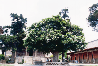 千年古柏與娑羅 在陽(yáng)臺(tái)宮三清殿前,有四株古柏和一株娑羅樹(shù),樹(shù)齡均在千年以上。古柏狀似云龍丹鳳,故稱龍柏和鳳柏。尤為人稱道的是道院中間的千年娑羅樹(shù)。娑羅樹(shù)本是佛門標(biāo)志性樹(shù)種,又名七葉樹(shù)。具傳說(shuō)是玉真公主栽下的。每年春夏之交,一串串穗狀白花開(kāi)滿枝頭,好似千百個(gè)白玉小塔,在綠葉的映襯下,鮮艷奪目,給莊嚴(yán)的道院平添無(wú)限生機(jī)。它留給今天的信息,證實(shí)著一千多年前佛道相融的歷史。