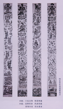 三清殿30根石柱上有很多高浮雕神話故事,“雷公電母”刻于殿門左側(cè)第二根石柱上。雷公電母在道教文化中是專司雷電之神。雷公司雷,又稱雷師、雷神。電母司閃電,又稱金光圣母、閃電娘娘。雷公電母除了專司雷電外,還具有懲惡揚(yáng)善的神力。雷公坦露胸腹,背有雙翅,臉赤如猴,手執(zhí)鼓槌,敲擊周圍五面連環(huán)鼓;電母容貌如女,雙手執(zhí)鏡,以示閃電?! ?/p>