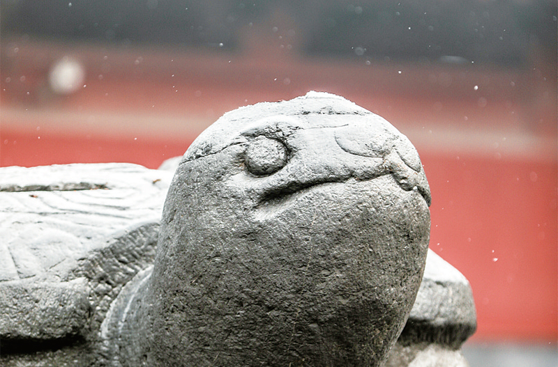 雪中的濟(jì)瀆廟,紅墻映雪,臘梅傲寒。古老的將軍柏在白雪的裝點下,更顯蒼勁挺拔。走過重重朱門,來到清凈的小北海,仿佛穿越了時空隧道。被銀色包裹的人文勝境,竟是如此的美麗。