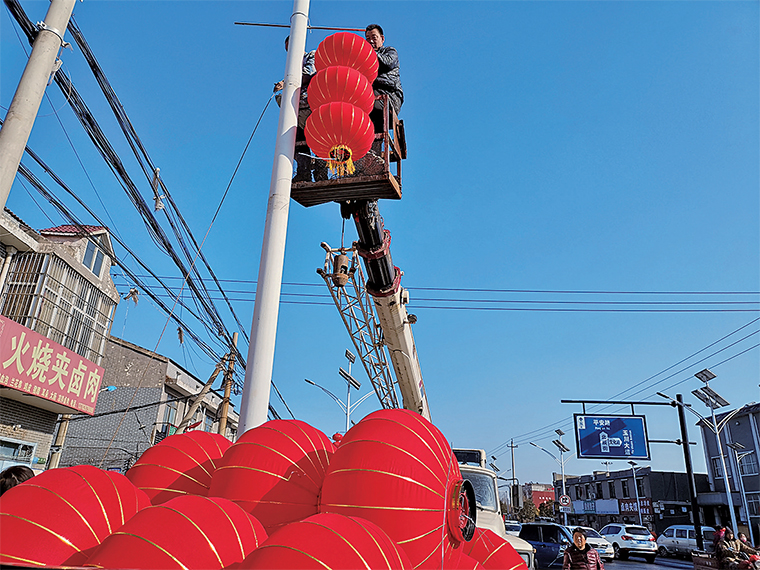 1月19日,在克井鎮(zhèn)克井村的中心街道上,工作人員正在懸掛紅燈籠。