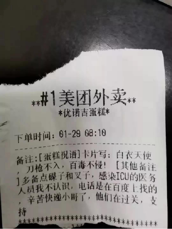 1月29日下午,一份愛(ài)心蛋糕外賣被送到了南陽(yáng)市市中心醫(yī)院。這位點(diǎn)外賣的熱心市民匿名在外賣小票上備注:“祝愿白衣天使,刀槍不入,百毒不侵!多備點(diǎn)碟子和叉子,感染ICU的醫(yī)務(wù)人員我不認(rèn)識(shí),電話是在百度上找的,辛苦快遞小哥了,他們?cè)谶^(guò)關(guān),支持!”