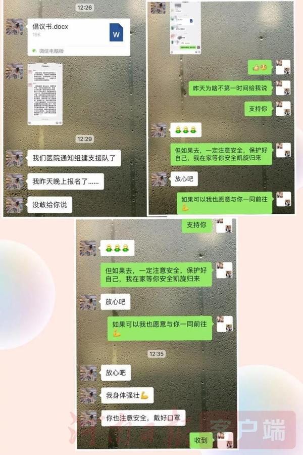 葉璐是洛陽(yáng)特警支隊(duì)一名輔警,妻子孫瑞琳是鄭州大學(xué)附屬洛陽(yáng)市中心醫(yī)院護(hù)士。在得知單位組建醫(yī)療隊(duì)準(zhǔn)備奔赴武漢前線支援消息后,孫瑞琳主動(dòng)報(bào)名,向醫(yī)院申請(qǐng)參戰(zhàn)。而葉璐也一直工作在一線,積極參加執(zhí)勤巡邏任務(wù),兩人以這種別樣的方式,默默表達(dá)對(duì)彼此的支持和鼓勵(lì)。