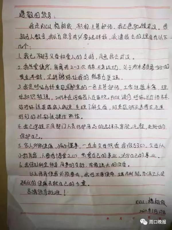 “尊敬的領(lǐng)導(dǎo):我是RICU楊相依,職稱主管護師,我志愿馳援武漢。因報名人數(shù)多,我認(rèn)為領(lǐng)導(dǎo)有必要選擇我。派遣我去的理由有以下幾個……”1月27日,在得知醫(yī)院將組建援鄂第一梯隊后,29歲的楊相依主動向醫(yī)院領(lǐng)導(dǎo)申請加入。