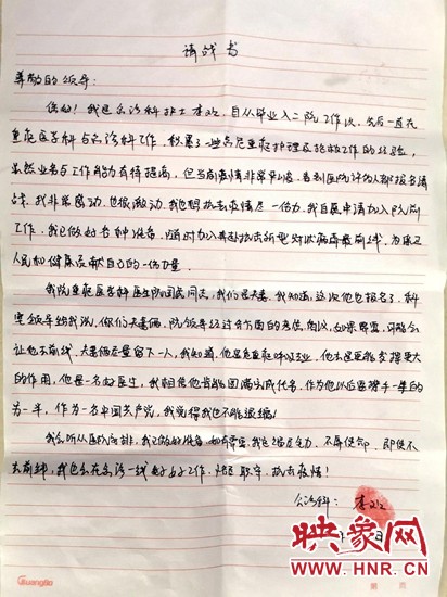 李歡得知情況后,連夜寫出“請戰(zhàn)書”第二天鄭重的交到了院黨委,她說:“我丈夫從事危重癥呼吸專業(yè),他去前線定能發(fā)揮更大的作用,他是一名好醫(yī)生,我相信他肯定能圓滿完成任務(wù)。而我作為他的妻子,作為一名黨員,更不能退縮,我們已經(jīng)做好了一切準備并肩作戰(zhàn)!聽從組織安排,恪盡職守,抗擊疫情。”