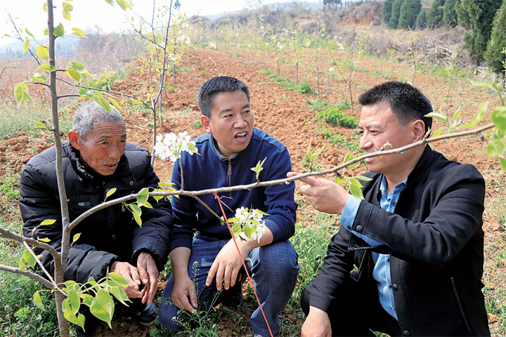 駐村第一書記劉召喚(中)查看林果產(chǎn)業(yè)