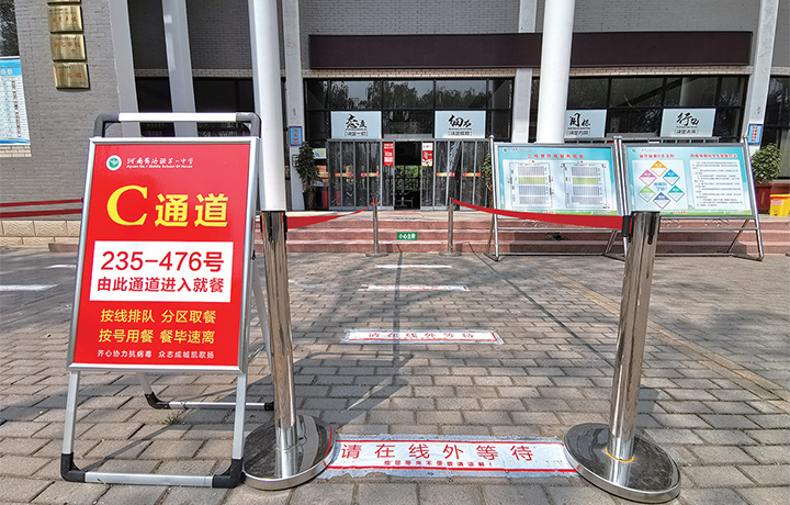 昨日,3號(hào)餐廳前被劃分出4條通道。每條通道前設(shè)置有提示牌,顯示著學(xué)生進(jìn)入餐廳的序號(hào)。地上每隔一米張貼著“請(qǐng)?jiān)诰€外等待”提示貼,要求學(xué)生注意間距,有序進(jìn)入。