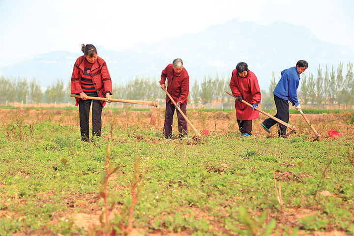 4月7日,五龍口鎮(zhèn)農(nóng)民在藥材地里鋤草。