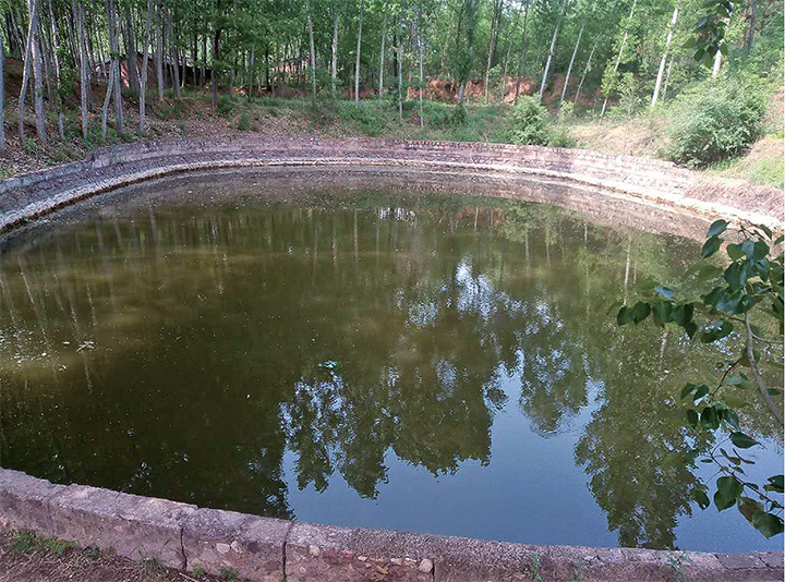 20世紀(jì)70年代,人工將原來(lái)的天然泉坑開(kāi)挖擴(kuò)建成混凝土池壁的蓄水大潭。村民俗稱(chēng)其后大潭。大潭東北西三面依山,呈不規(guī)則形狀,邊長(zhǎng)約50米,深約5米。潭東南角的山崖下一股清泉汩汩流出,潭西南角有人工小渠向外引水灌溉。