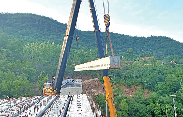 5月15日,在大峪鎮(zhèn)橋溝村,龍?zhí)稖蠘蚬こ淘谶M行橋梁板吊裝。