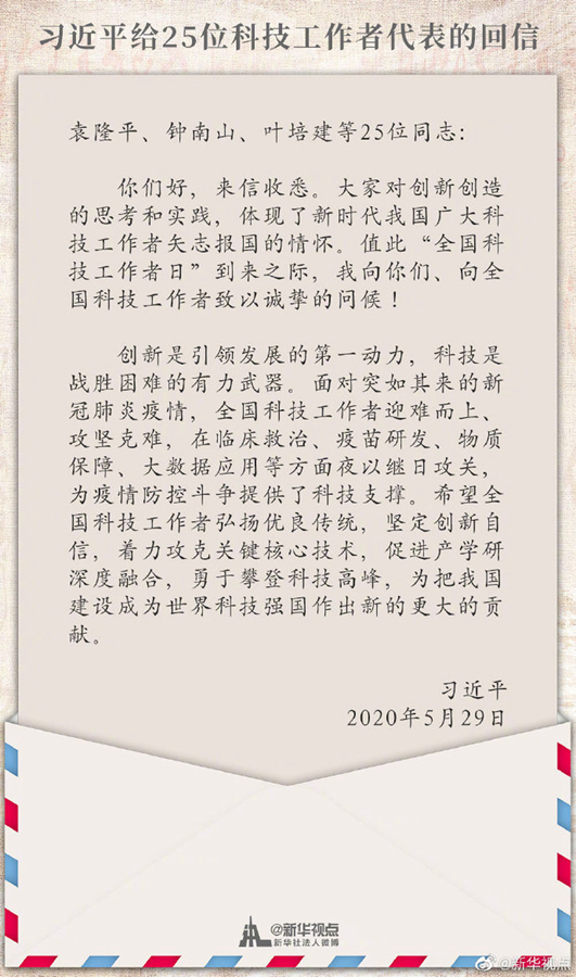 兩會剛剛閉幕。5月29日,一封充滿暖意的回信送到了25位科技工作者的手中。