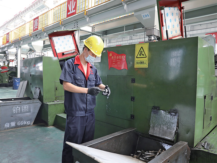 7月2日,河南國(guó)泰鉑固科技有限公司黨員孔龍龍正在搓絲。