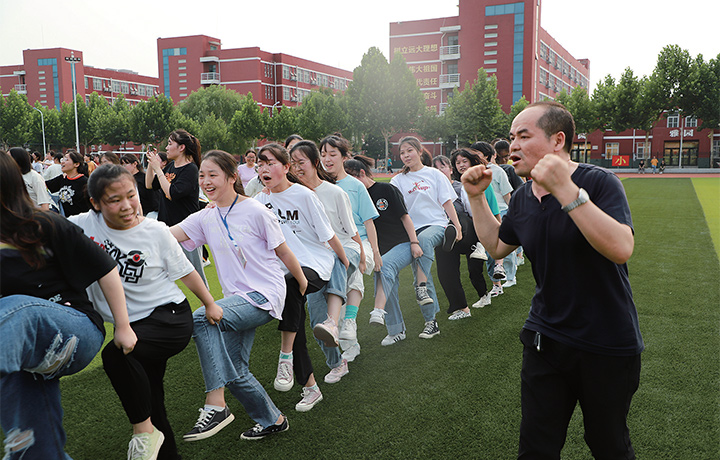 教師帶領(lǐng)高三學(xué)生在操場(chǎng)上做減壓游戲 李元元 攝