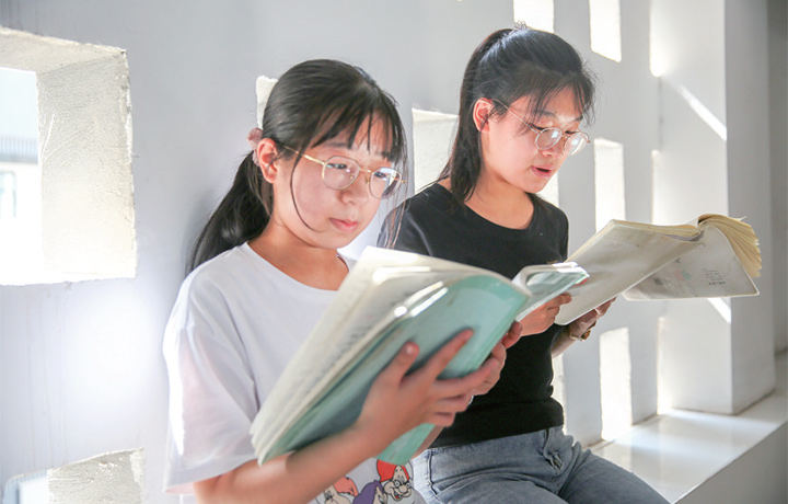 學(xué)生在走廊看書