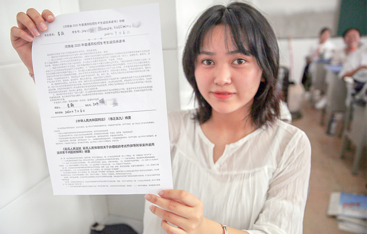 學(xué)生展示自己的《考生誠(chéng)信考試承諾書》