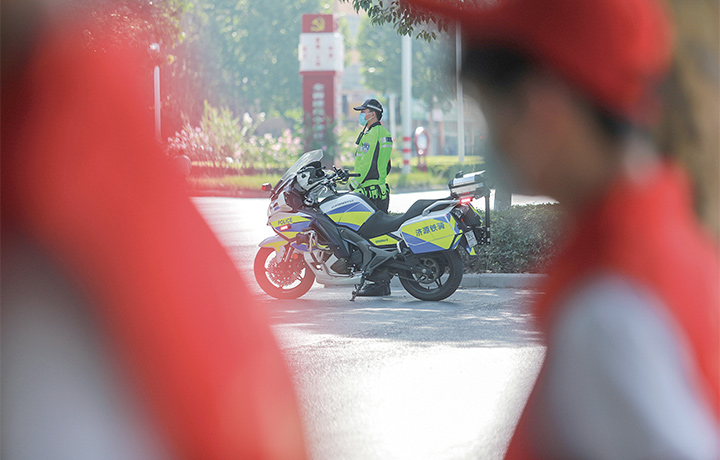 校門外,志愿者、騎警都已做好準(zhǔn)備 李元元 攝