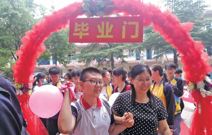 在濟水一中,有一位被同學們稱為“媽媽同學”的偉大母親李青霞來到了畢業(yè)典禮現(xiàn)場。三年學習期間,李青霞帶著身殘志堅的兒子孔致遠,不僅同班同桌學習,還參加了學校舉辦的運動會、讀書節(jié)等活動。畢業(yè)之際,孔致遠同學和他的媽媽給老師獻上鮮花,為母校贈送錦旗,以表達對學校和老師們的感激之情。典禮最后,孔致遠和陪讀三年的媽媽與畢業(yè)生們一起走過畢業(yè)門,在學弟學妹的夾道歡送中,順利邁上人生的新征程。