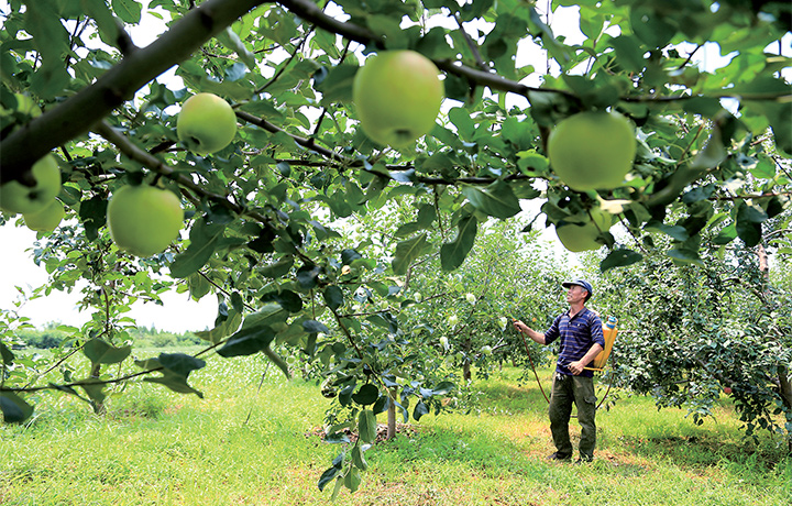 進入夏季后,蘋果管理尤為重要,果農(nóng)根據(jù)蘋果生長情況實時管理,防治病蟲害,保障蘋果品質(zhì)。記者 李浩 攝