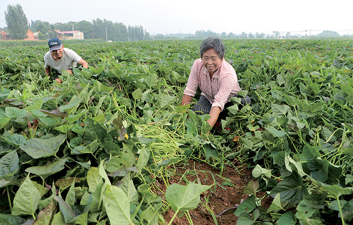 7月21日,在軹城鎮(zhèn)柏平村,農(nóng)民正在為紅薯翻藤。