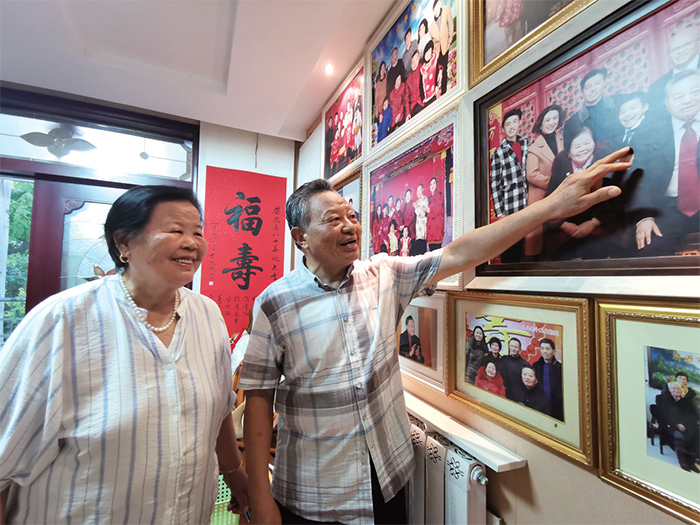 柴玉泉夫婦看著墻上不同時期的全家福不禁樂開了花