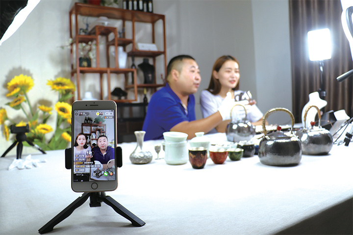 晚上8點(diǎn),在中國(guó)白銀城網(wǎng)絡(luò)直播孵化基地,“90后”主播高清源打開(kāi)手機(jī)里的直播軟件,面對(duì)手機(jī)做直播練習(xí)。她一邊試戴各種銀類(lèi)飾品,一邊描述著試戴體驗(yàn)。身邊指導(dǎo)她的師傅李亮則不時(shí)把商品鏈接放入直播間小店。