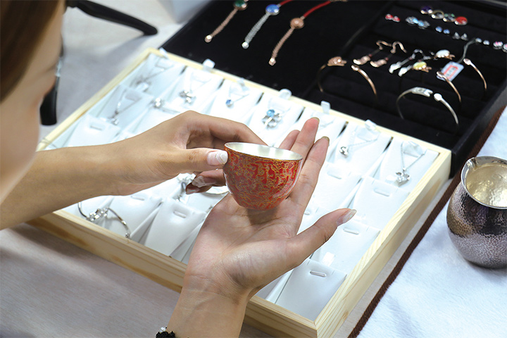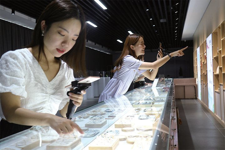 7月27日,高清源(右)和同事在展柜直播賣(mài)貨