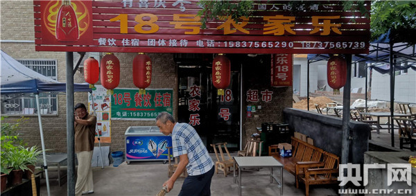 張溝村已脫貧的村民在自家經(jīng)營的農(nóng)家樂前打掃衛(wèi)生(央廣網(wǎng) 陳振華 攝)