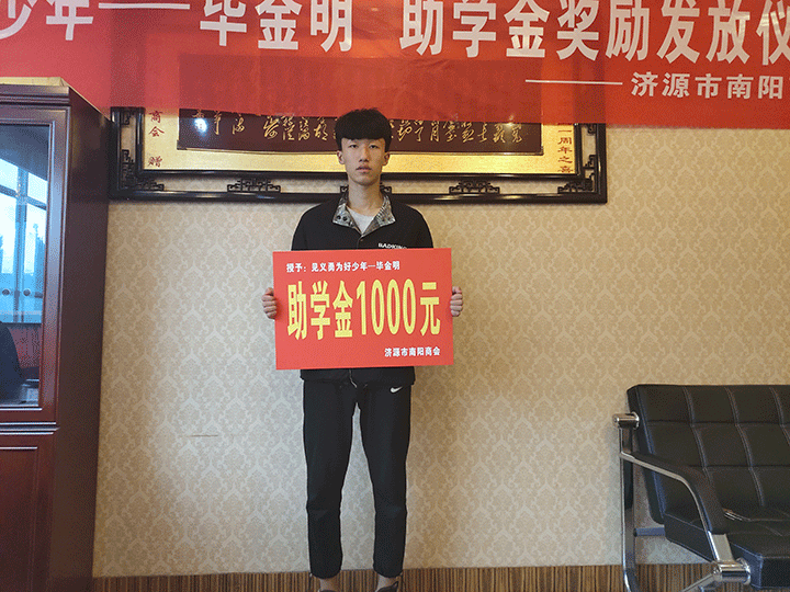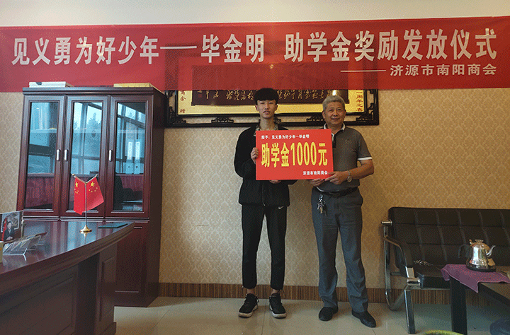 濟(jì)源市南陽商會為“見義勇為好少年”畢金明頒發(fā)助學(xué)金